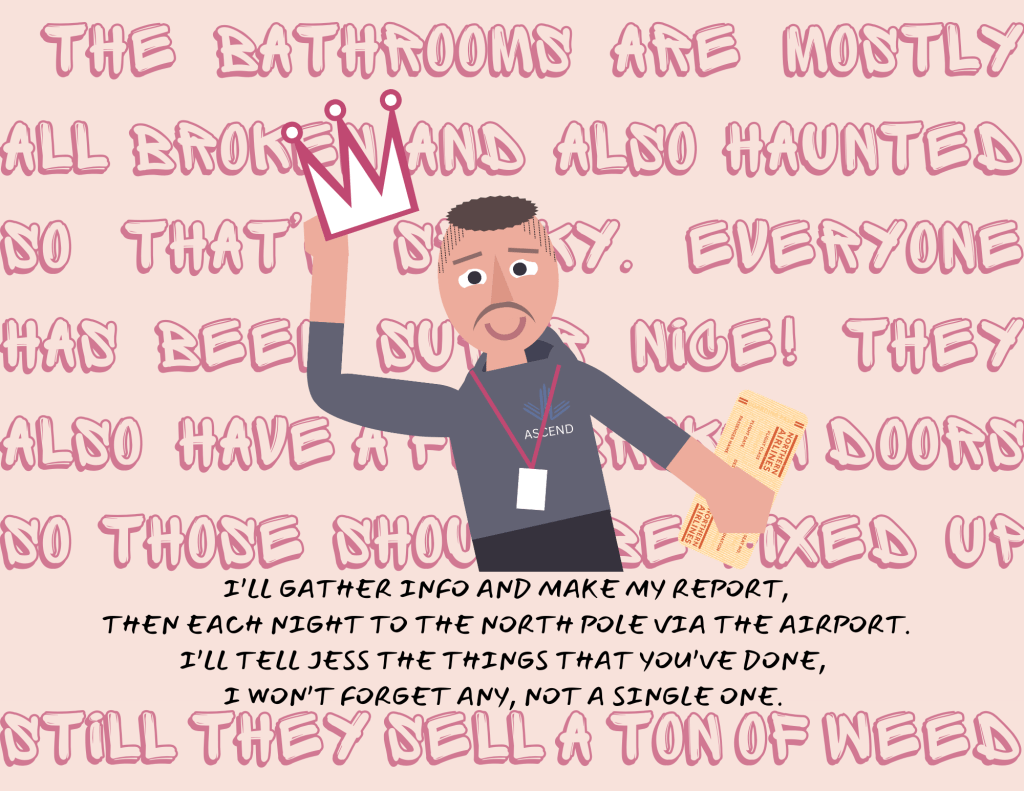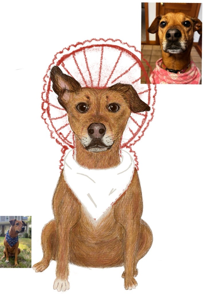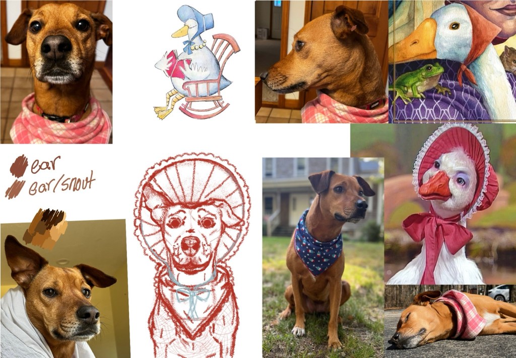 These six graphics were created in Canva for a clients family reunion. Each graphic represents a drink created by the client to represent the family elders and their respective personalities. The venue couldn’t accommodate all of the signature drinks that our client wanted so Mellow Mel and Peppy Pete were cut for room. But personally, Mellow Mel was my favorite of the designs.I drew these portraits of my dogs on Procreate to create a holiday card for my media instagram account ReineMedia. I was inspired by a cute photo my mom took of our dog Luna in her orange blowup cone and the song she used to sing as we decorated the Christmas tree, Santa Claus & Popcorn. It’s extra fitting as Buddy’s favorite snack is popcorn.I created Ascender on a Bender in one night during December 2023 on Canva. At the time I was working at a dispensary called Ascend and the chaos of the holiday season inspired me to re-write Elf on a Shelf as a little gift for my managers. It ended up being printed and bound by an upper manager as a gift for one of our executives.Checkout the samples of my character design process from Canva. I ended up creating a fully functioning and posable paper doll Ascender for us to hide and hang around the dispensary. The other faces were only used in the book, shoutout to my coworkers for being so supportive of my creativity and letting me use their faces.A work in progress but a deeper more detailed look into my character design process using Procreate. This is a custom art piece I am creating for a friend’s baby nursery using the colors of the rug and photos of their dog Goose to create their very own Mother Goose portrait.